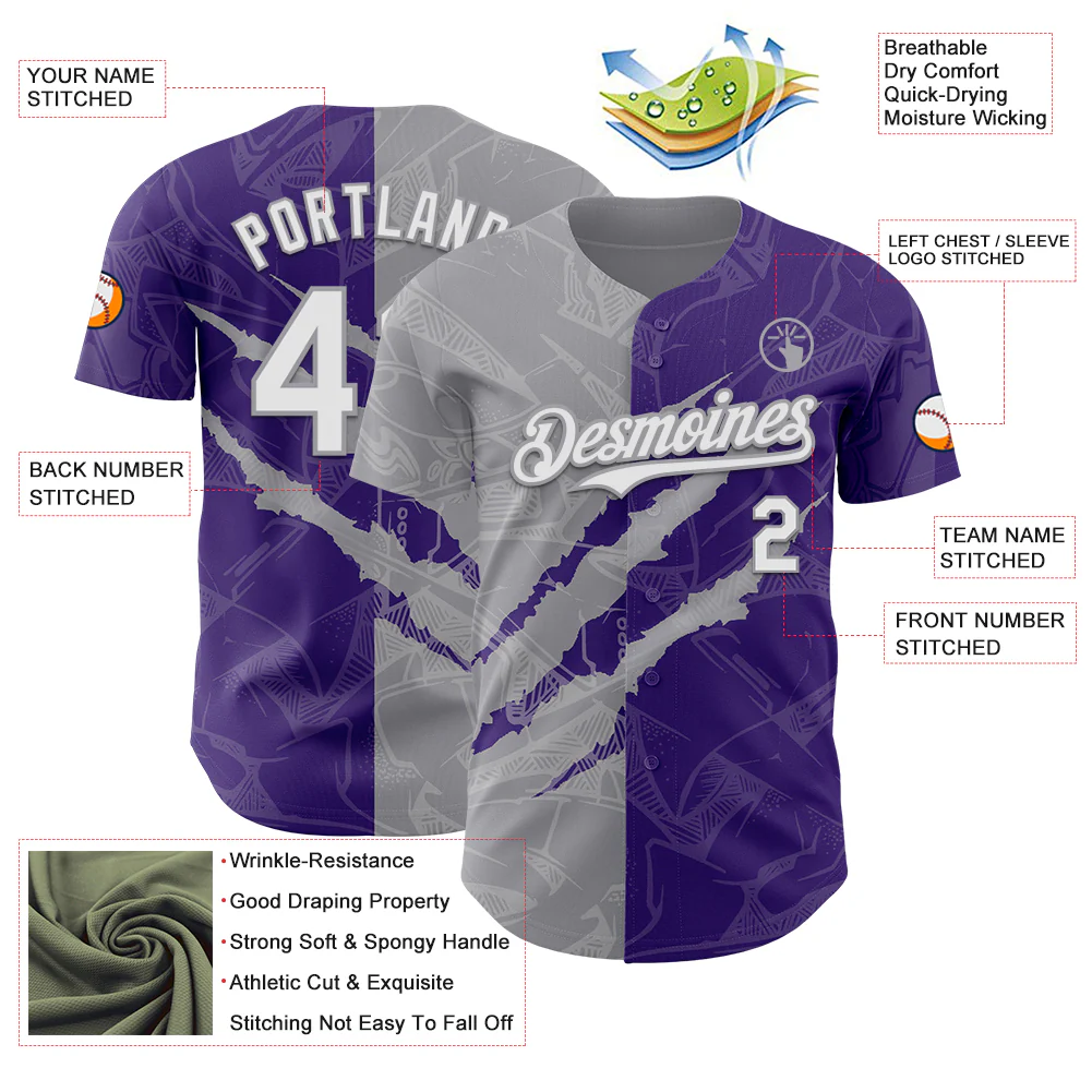 Custom Graffiti Pattern White Purple-Gray 3D Scratch Authentic Baseball Jersey