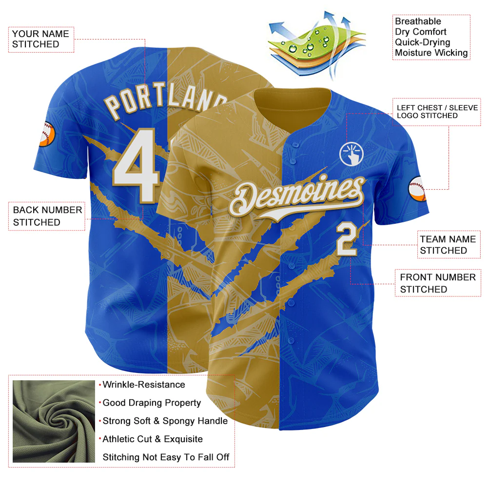 Custom Graffiti Pattern White Thunder Blue-Old Gold 3D Scratch Authentic Baseball Jersey