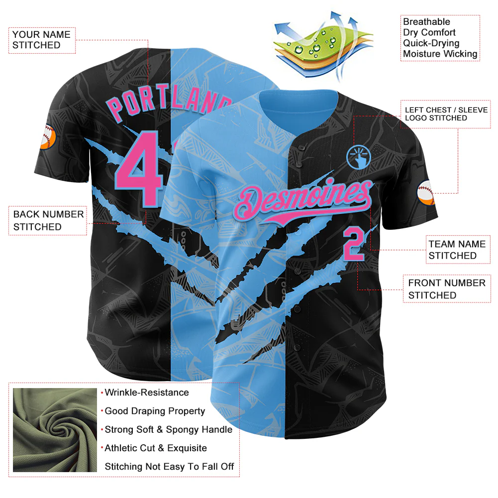 Custom Graffiti Pattern Pink Black-Sky Blue 3D Scratch Authentic Baseball Jersey