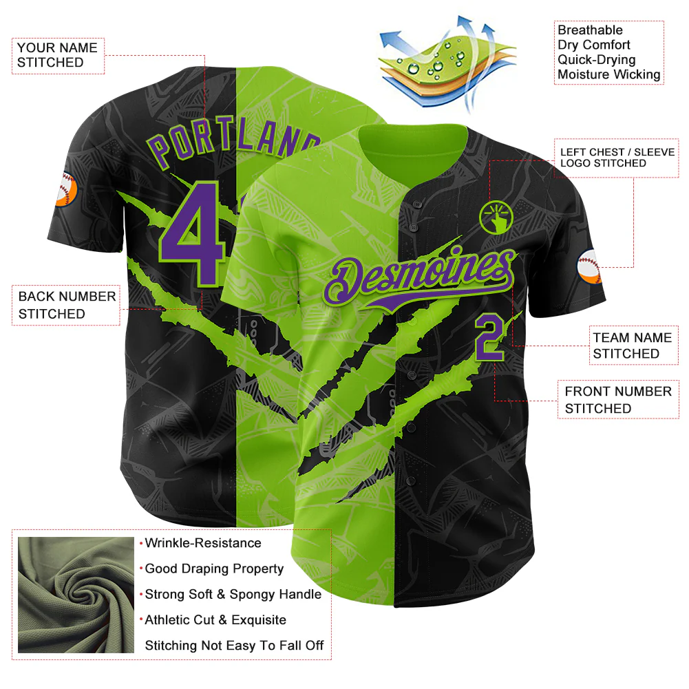 Custom Graffiti Pattern Purple Black-Neon Green 3D Scratch Authentic Baseball Jersey