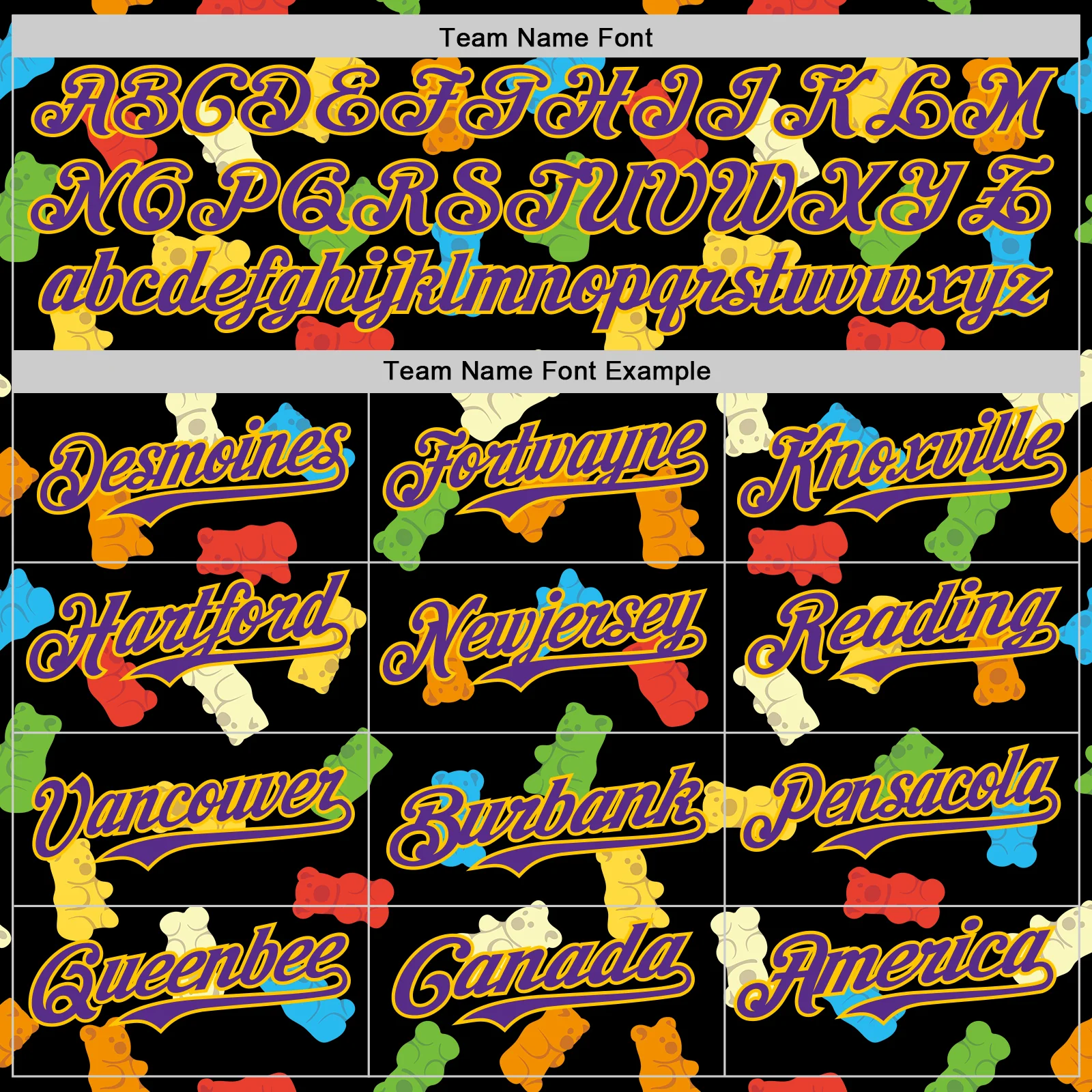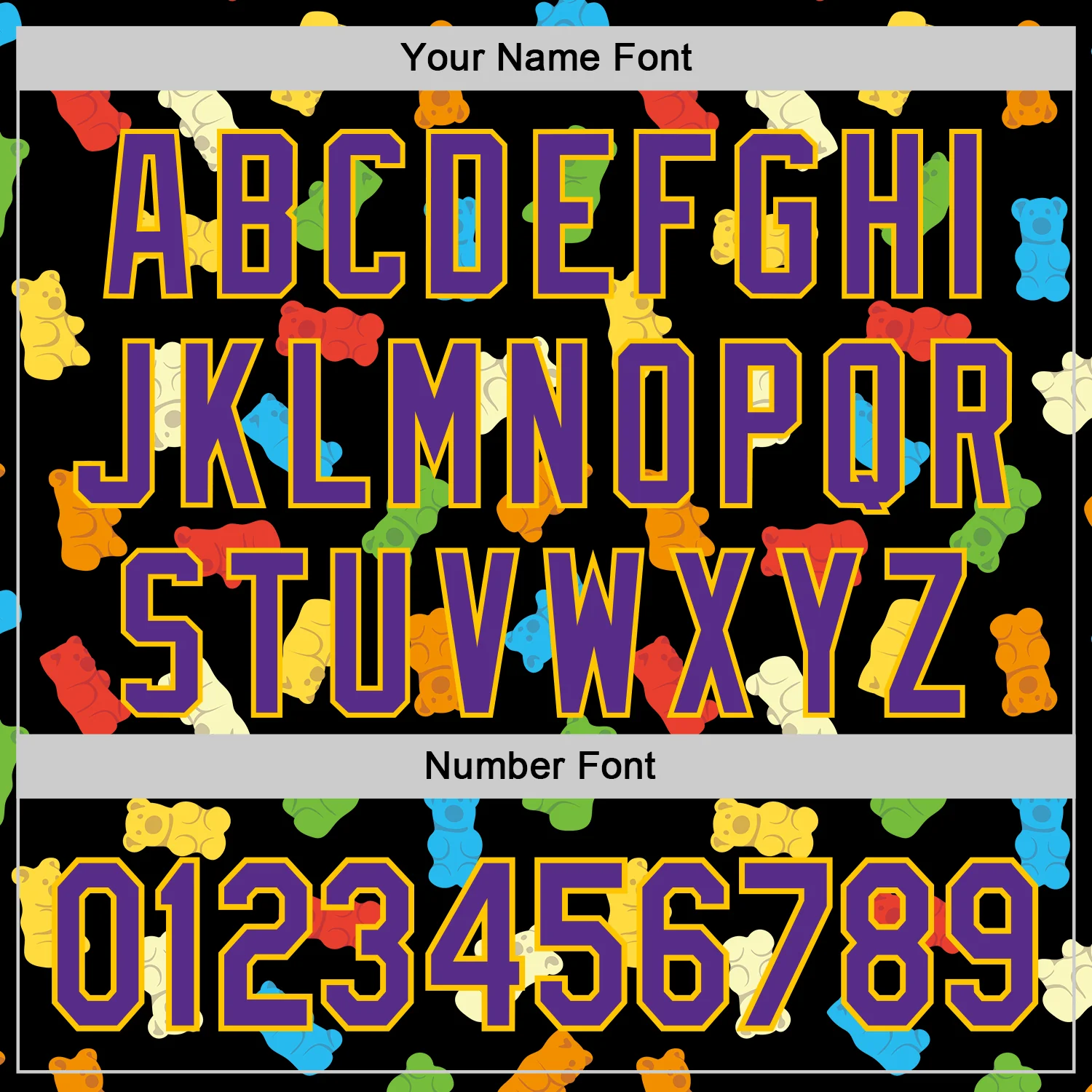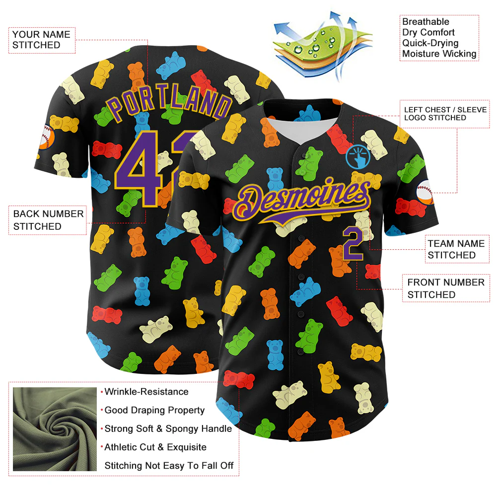 Custom Black Purple-Yellow 3D Pattern Design Foodie Food Snack Gummy Bear Authentic Baseball Jersey