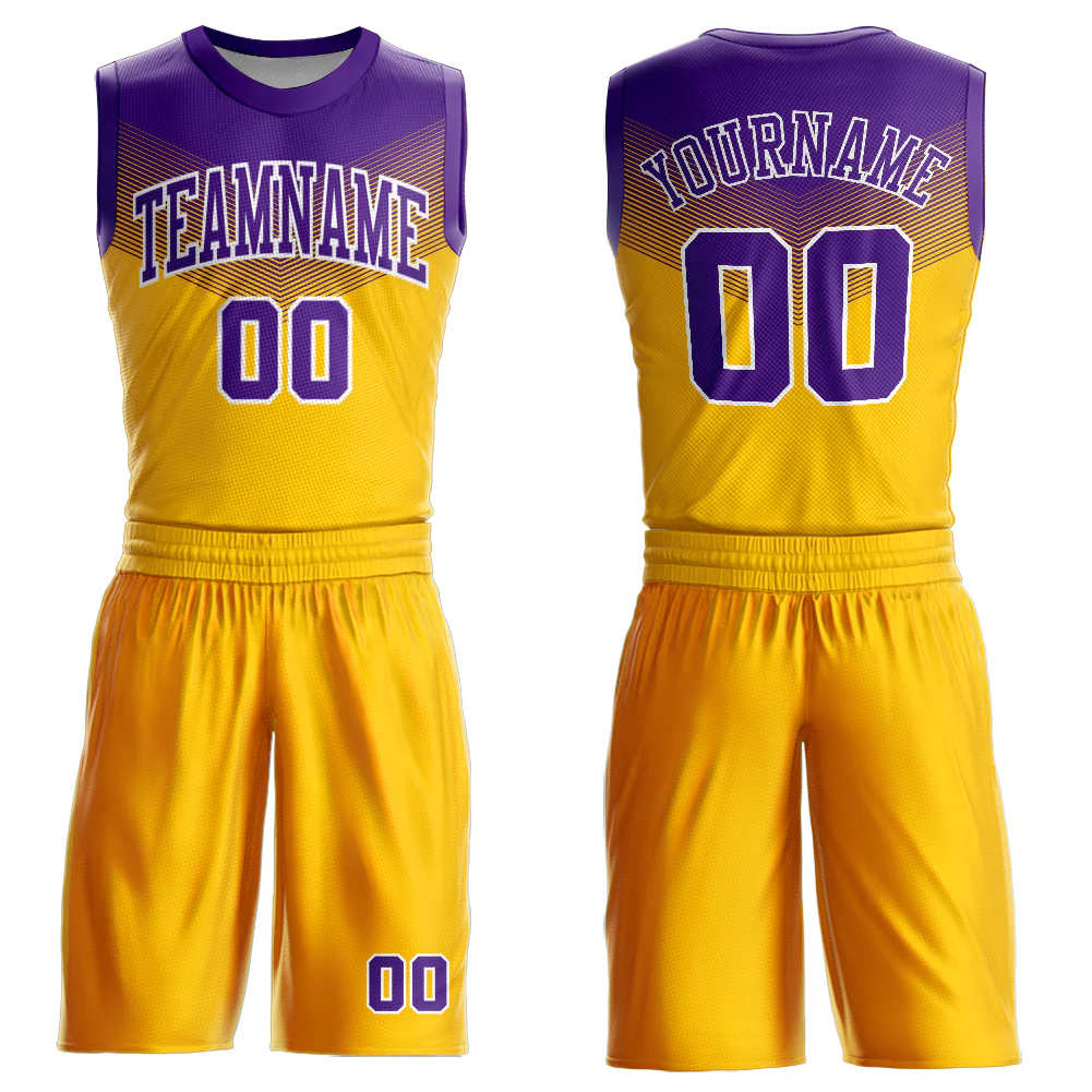 Custom Gold Purple-White Round Neck Sublimation Basketball Suit Jersey