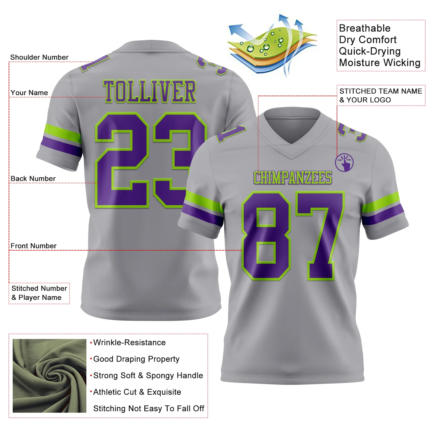 Custom Gray Purple-Neon Green Authentic Football Jersey