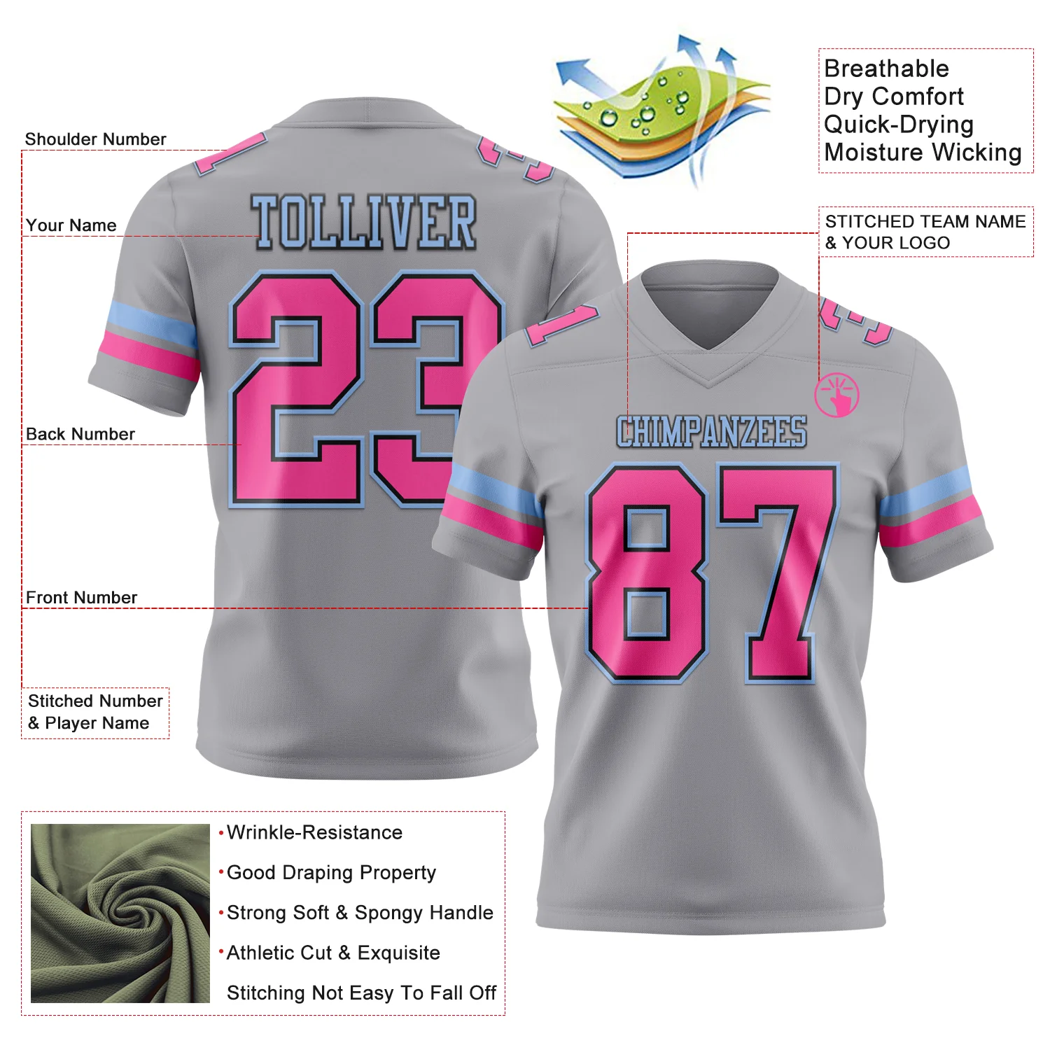 Custom Gray Pink Black-Light Blue Authentic Football Jersey