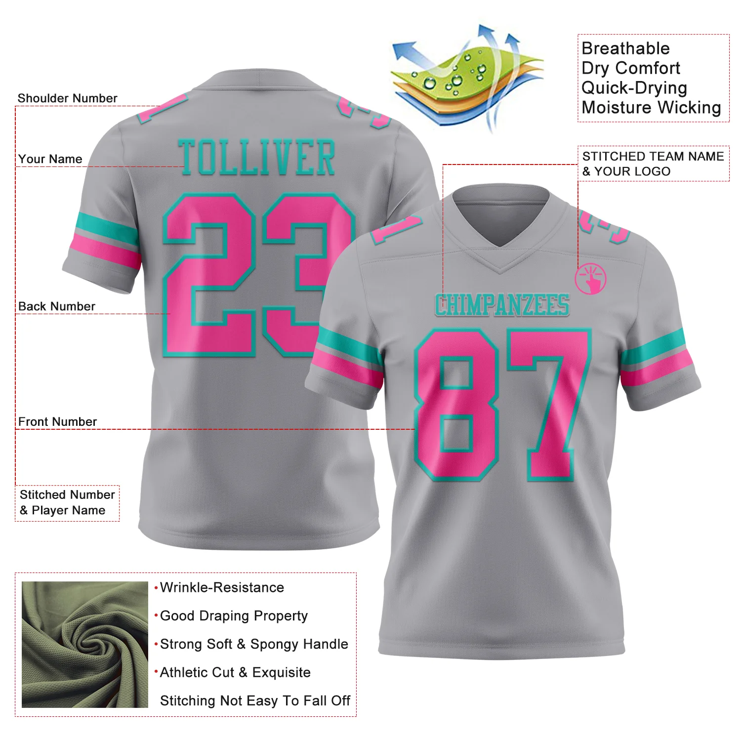 Custom Gray Pink-Aqua Authentic Football Jersey
