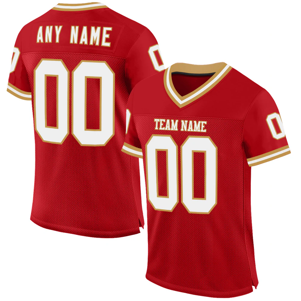 Custom Red White-Old Gold Mesh Authentic Throwback Football Jersey