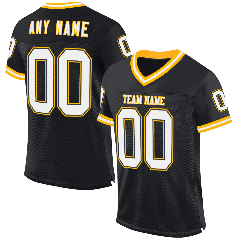Custom Black White-Gold Mesh Authentic Throwback Football Jersey