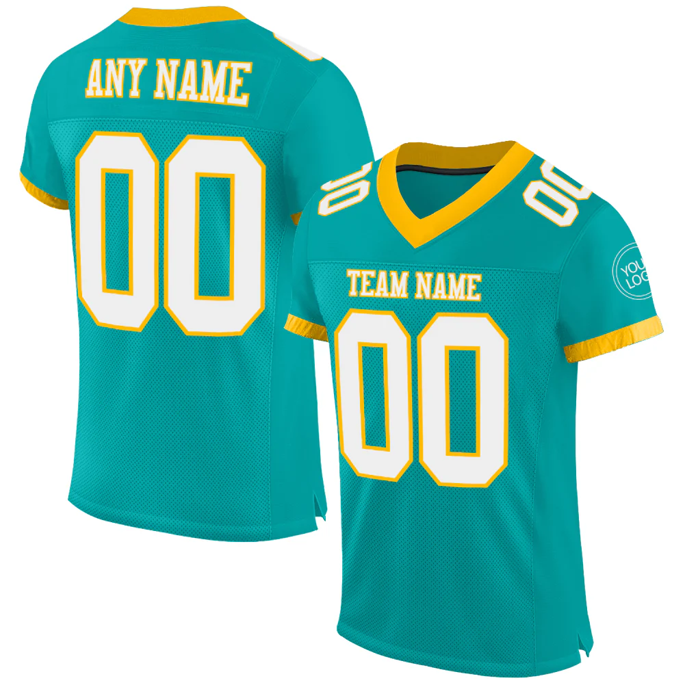 Custom Aqua White-Gold Mesh Authentic Football Jersey
