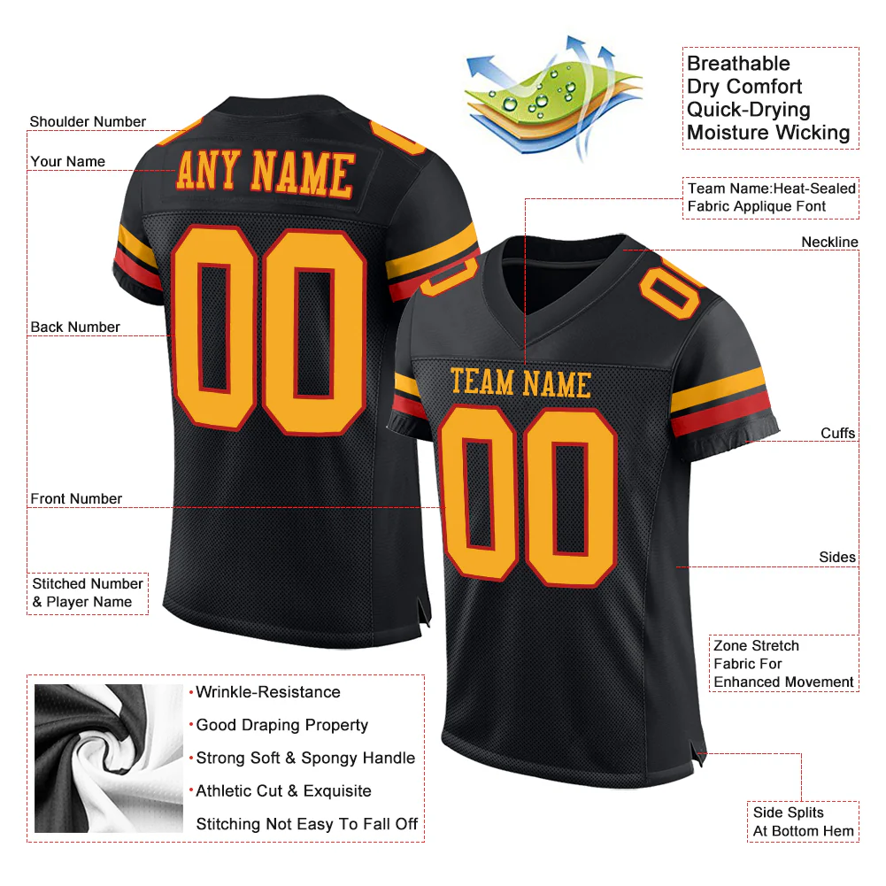Custom Black Gold-Scarlet Mesh Authentic Football Jersey