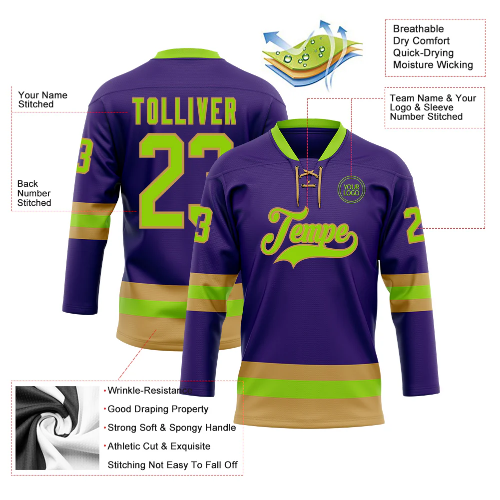 Custom Purple Neon Green-Old Gold Hockey Lace Neck Jersey