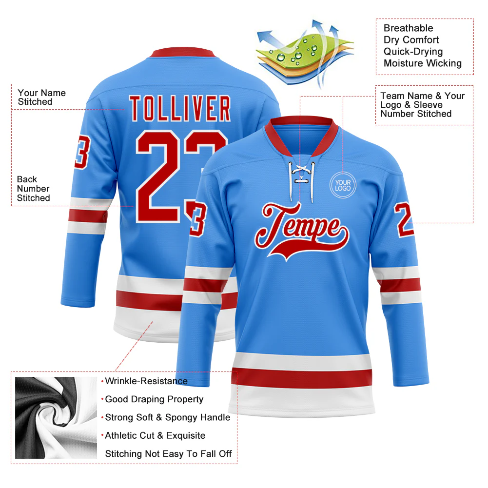 Custom Sky Blue Red-White Hockey Lace Neck Jersey