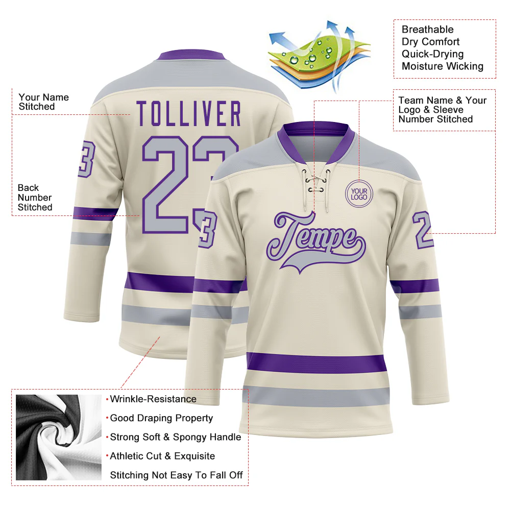 Custom Cream Gray-Purple Hockey Lace Neck Jersey