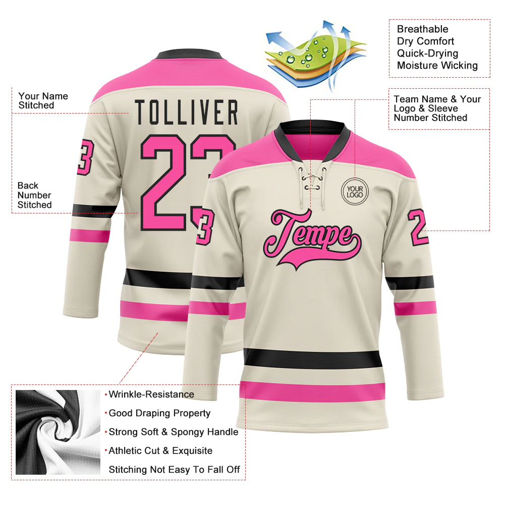 Custom Cream Medium Pink-Black Hockey Lace Neck Jersey