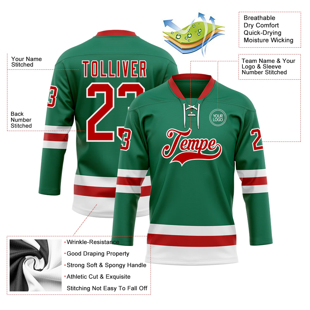Custom Kelly Green Red-White Hockey Lace Neck Jersey
