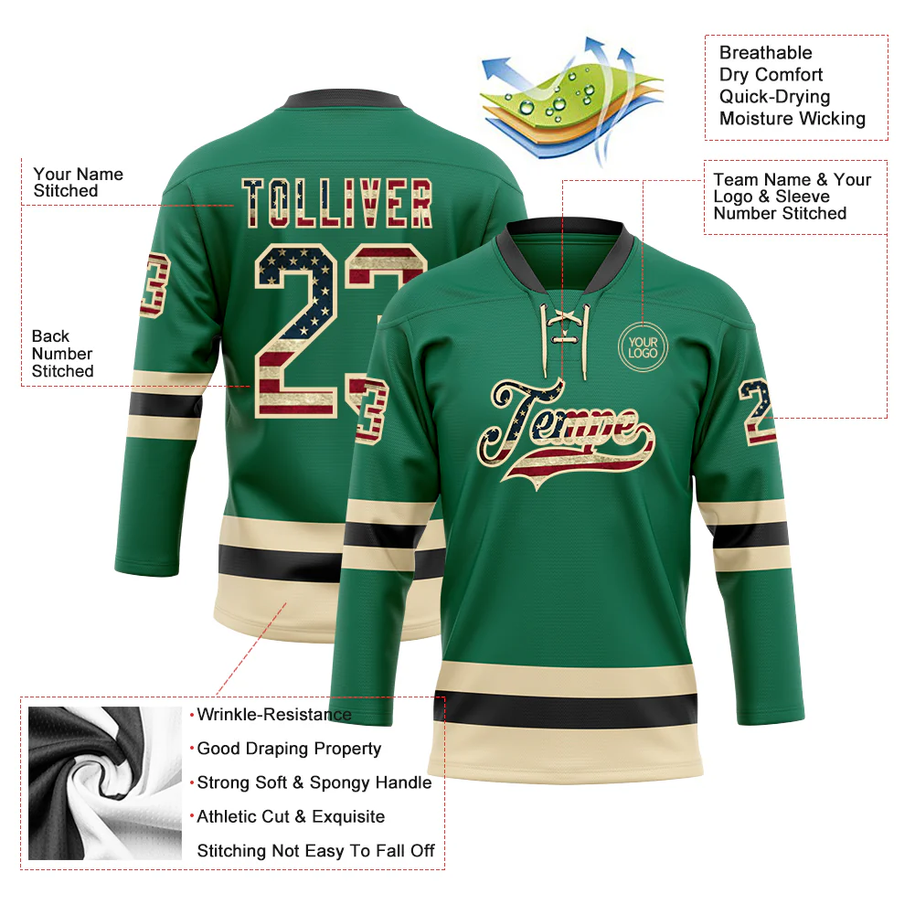 Custom Kelly Green Vintage USA Flag Cream-Black Hockey Lace Neck Jersey