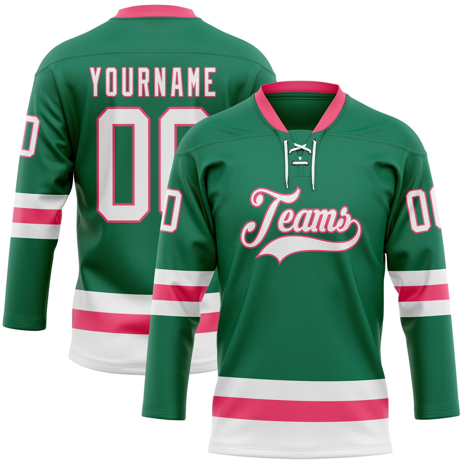 Custom Kelly Green Medium Pink-Black Hockey Lace Neck Jersey