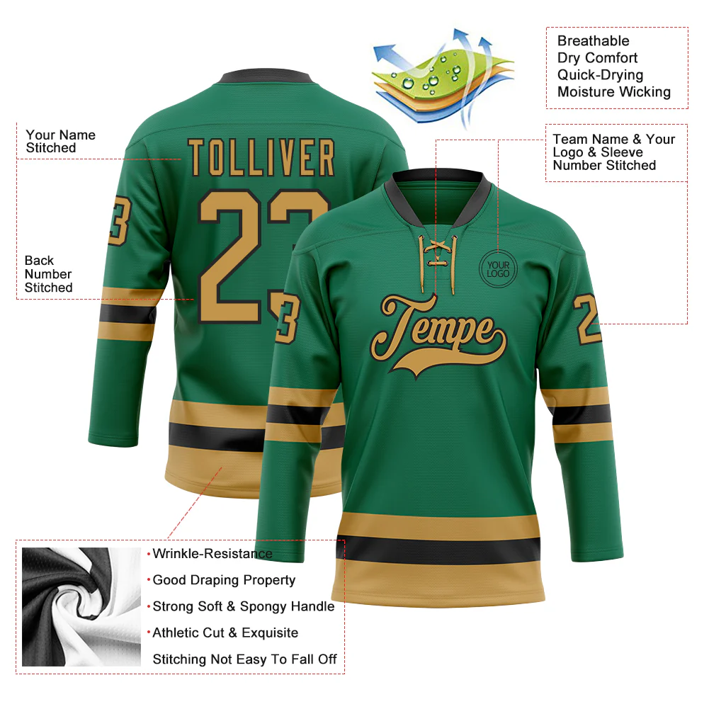 Custom Kelly Green Old Gold-Black Hockey Lace Neck Jersey