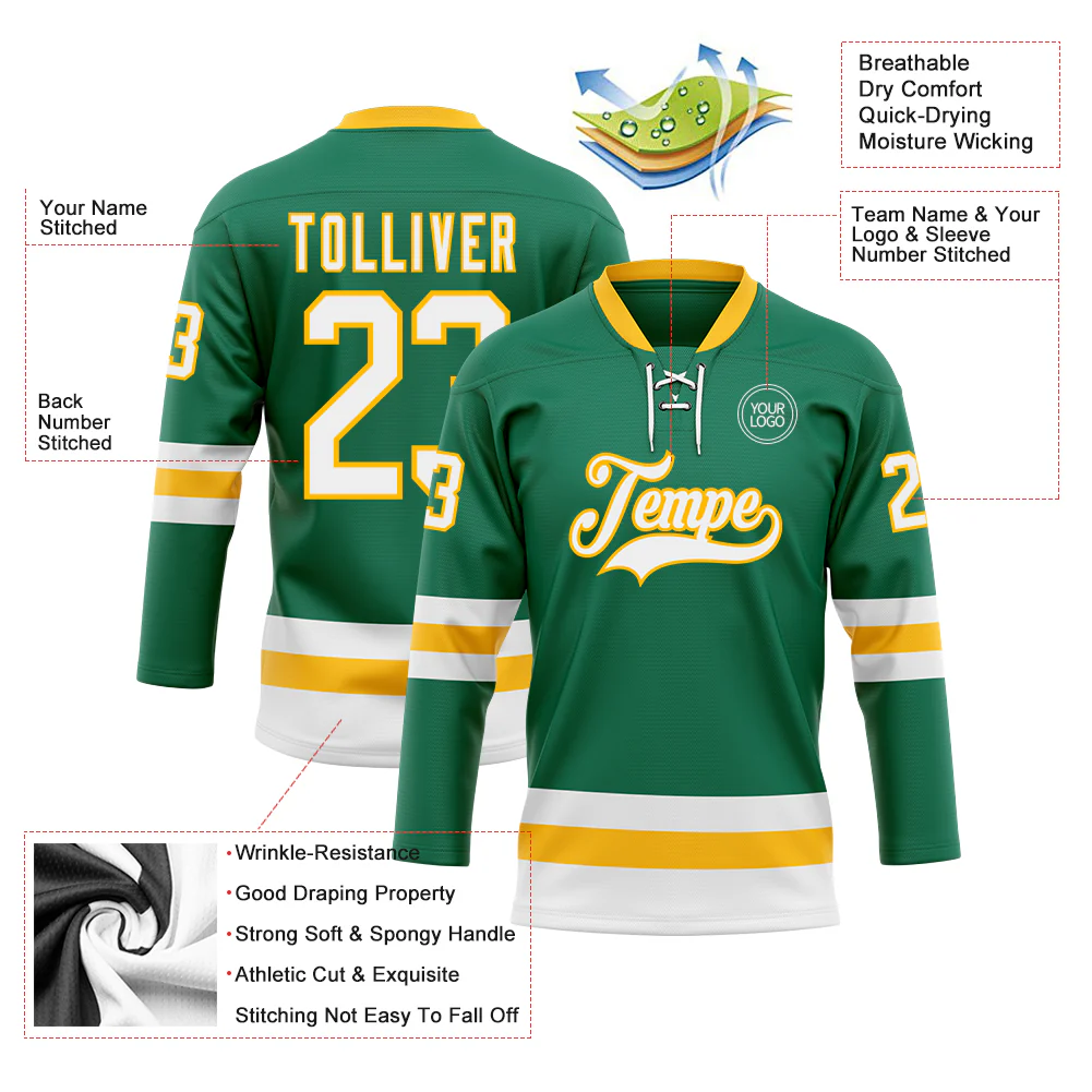 Custom Kelly Green White-Gold Hockey Lace Neck Jersey