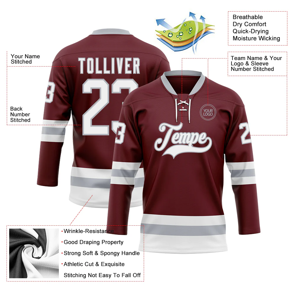 Custom Burgundy White-Gray Hockey Lace Neck Jersey