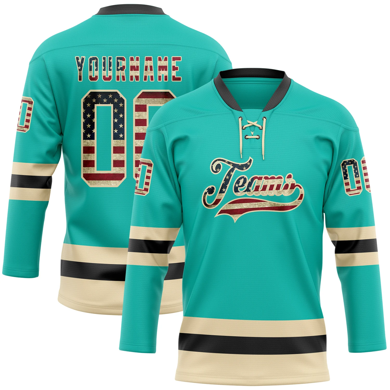 Custom Aqua Vintage USA Flag Cream-Black Hockey Lace Neck Jersey