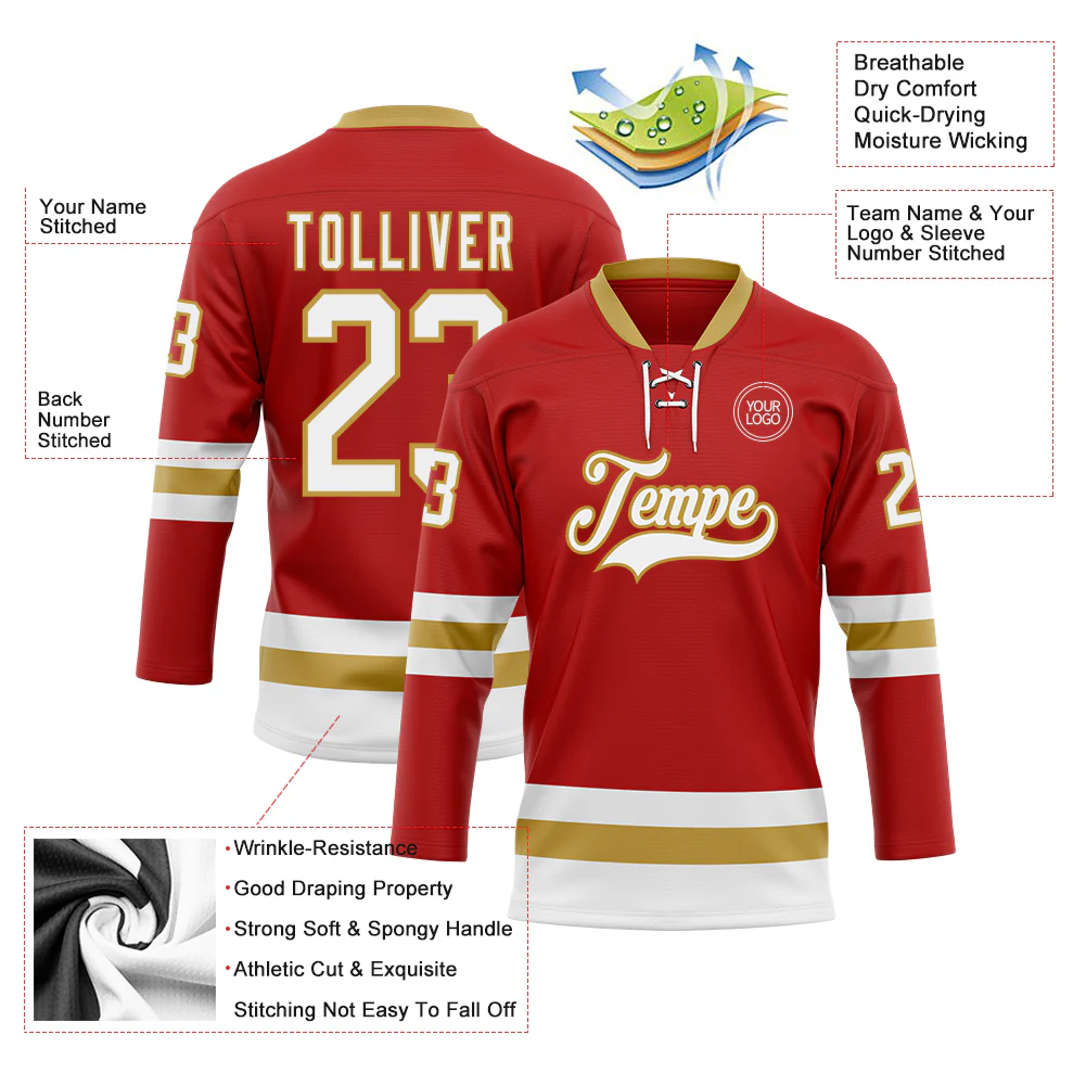 Custom Red White-Old Gold Hockey Lace Neck Jersey