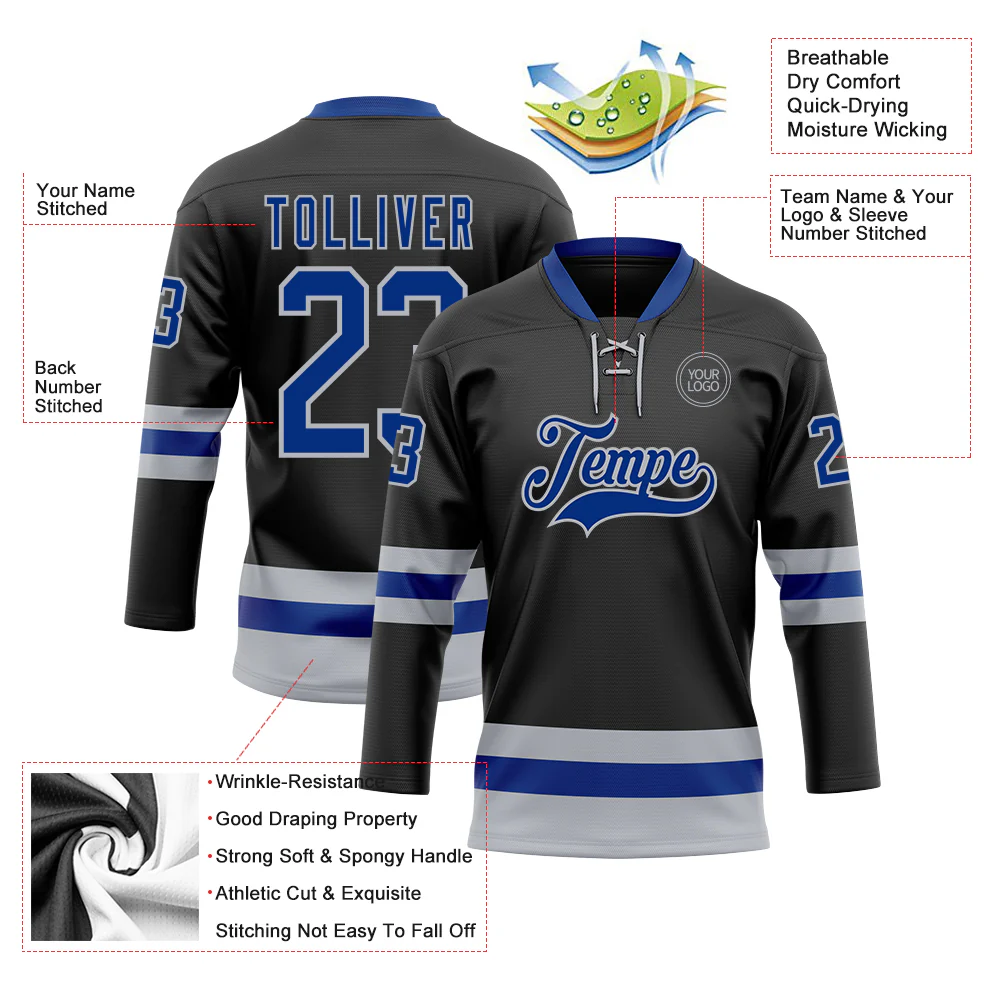 Custom Black Royal-Gray Hockey Lace Neck Jersey