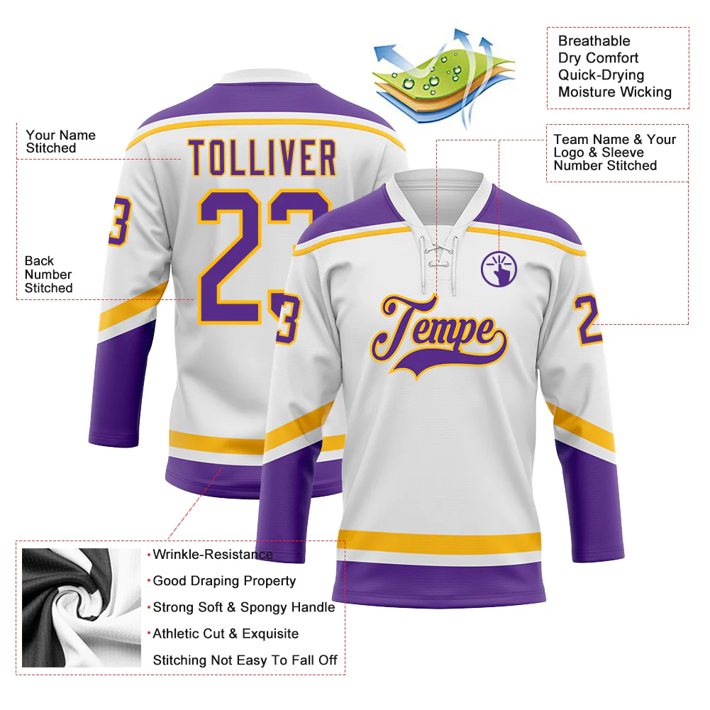 Custom White Purple-Gold Hockey Lace Neck Jersey