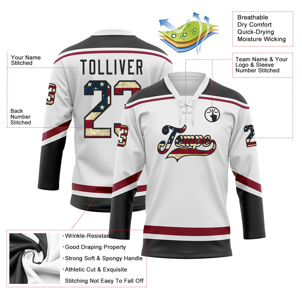 Custom White Vintage USA Flag Black-Maroon Hockey Lace Neck Jersey