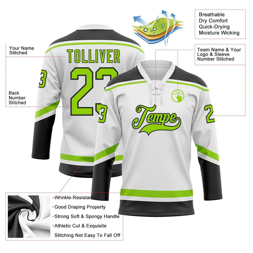 Custom White Neon Green-Black Hockey Lace Neck Jersey