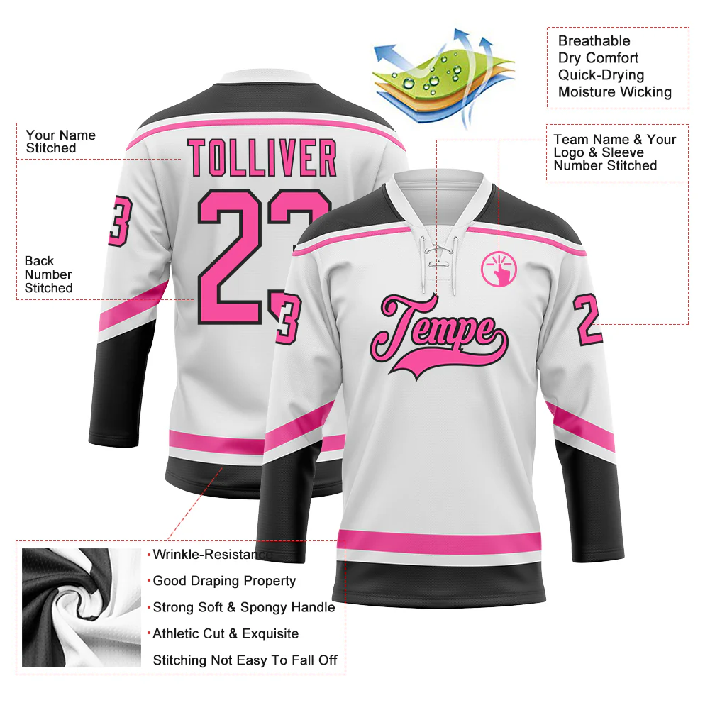 Custom White Pink-Black Hockey Lace Neck Jersey