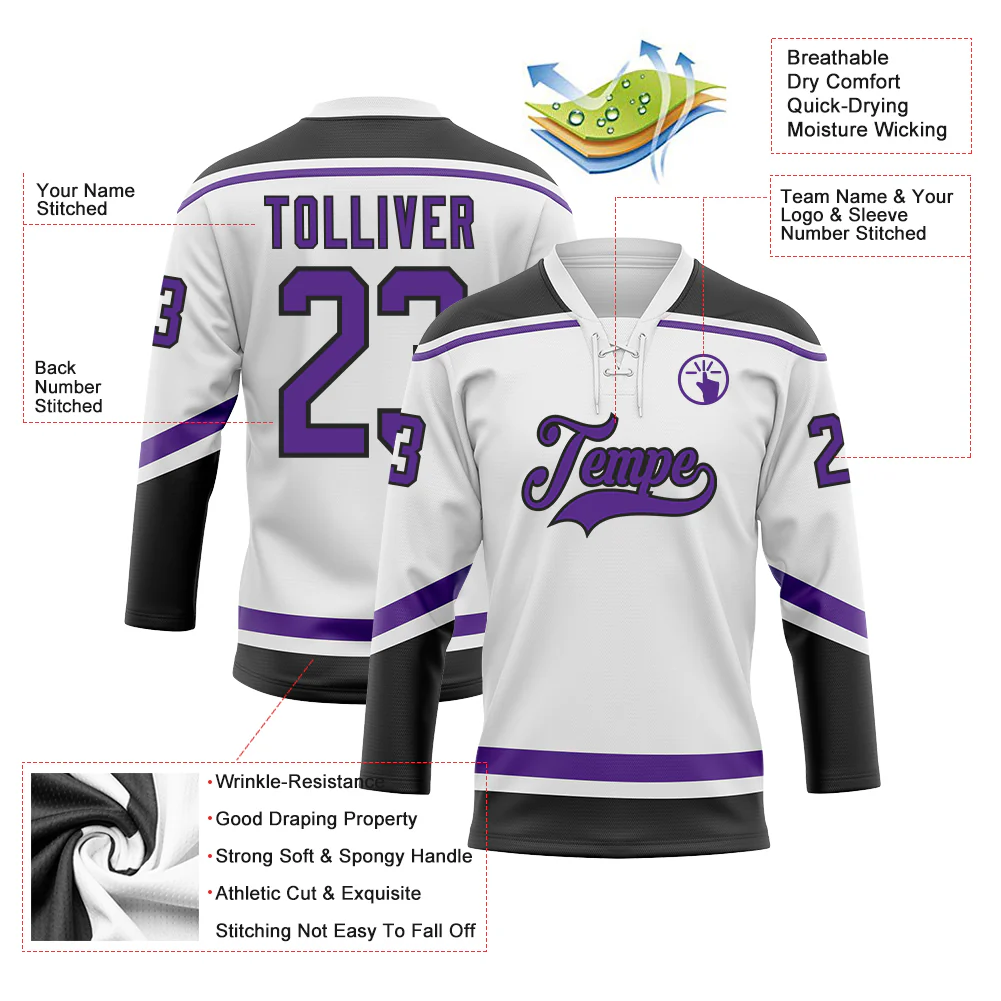 Custom White Purple-Black Hockey Lace Neck Jersey