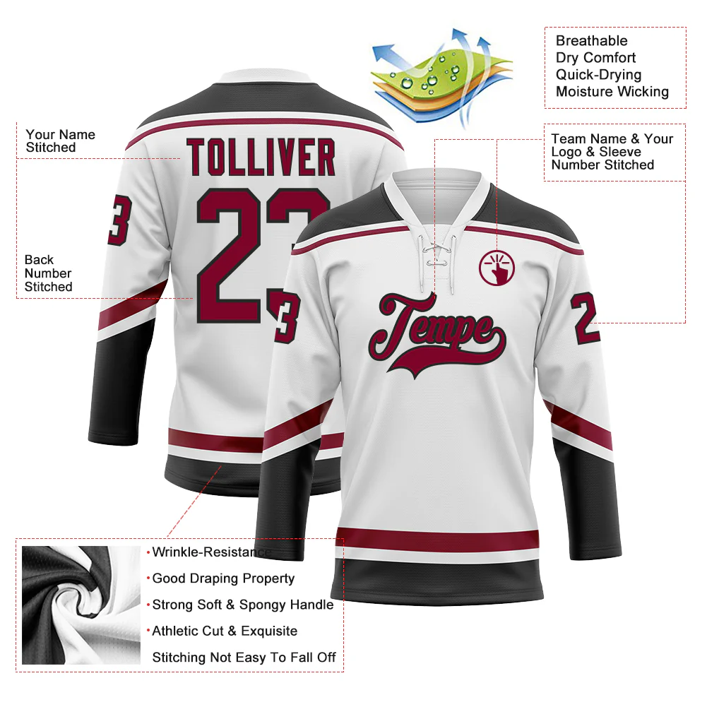 Custom White Maroon-Black Hockey Lace Neck Jersey
