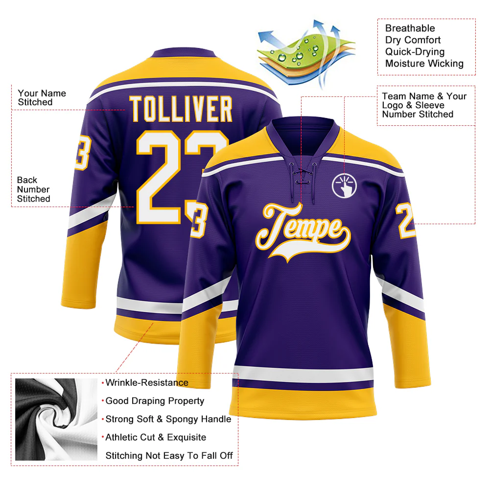 Custom Purple White-Gold Hockey Lace Neck Jersey