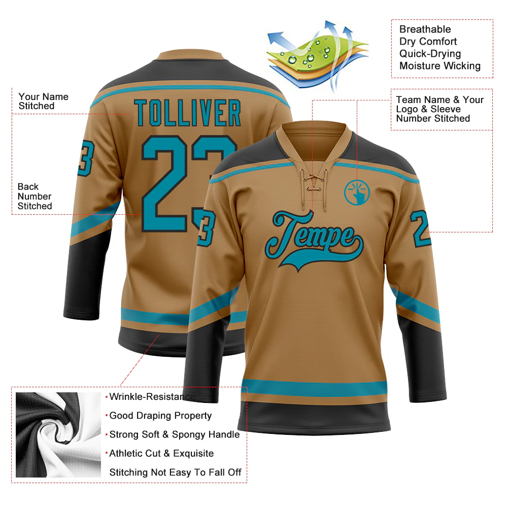 Custom Old Gold Teal-Black Hockey Lace Neck Jersey