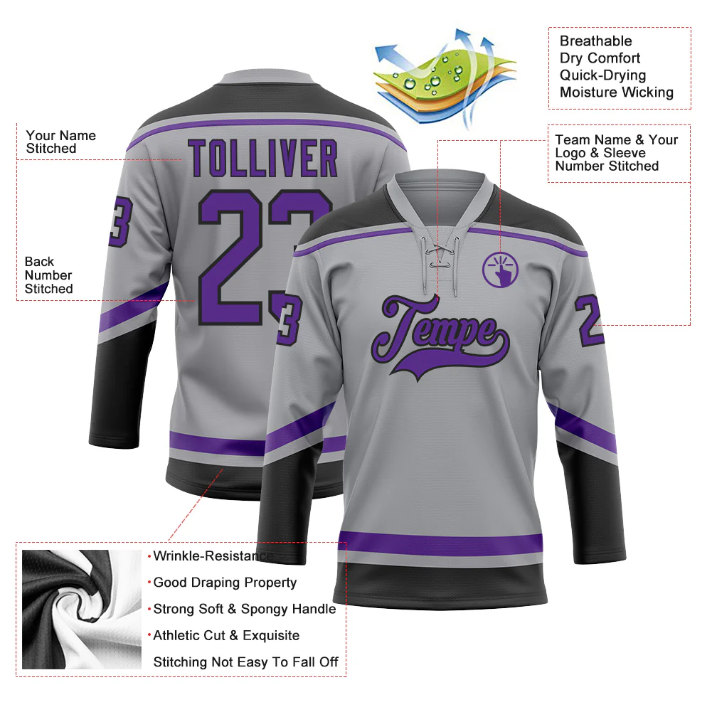 Custom Gray Purple-Black Hockey Lace Neck Jersey