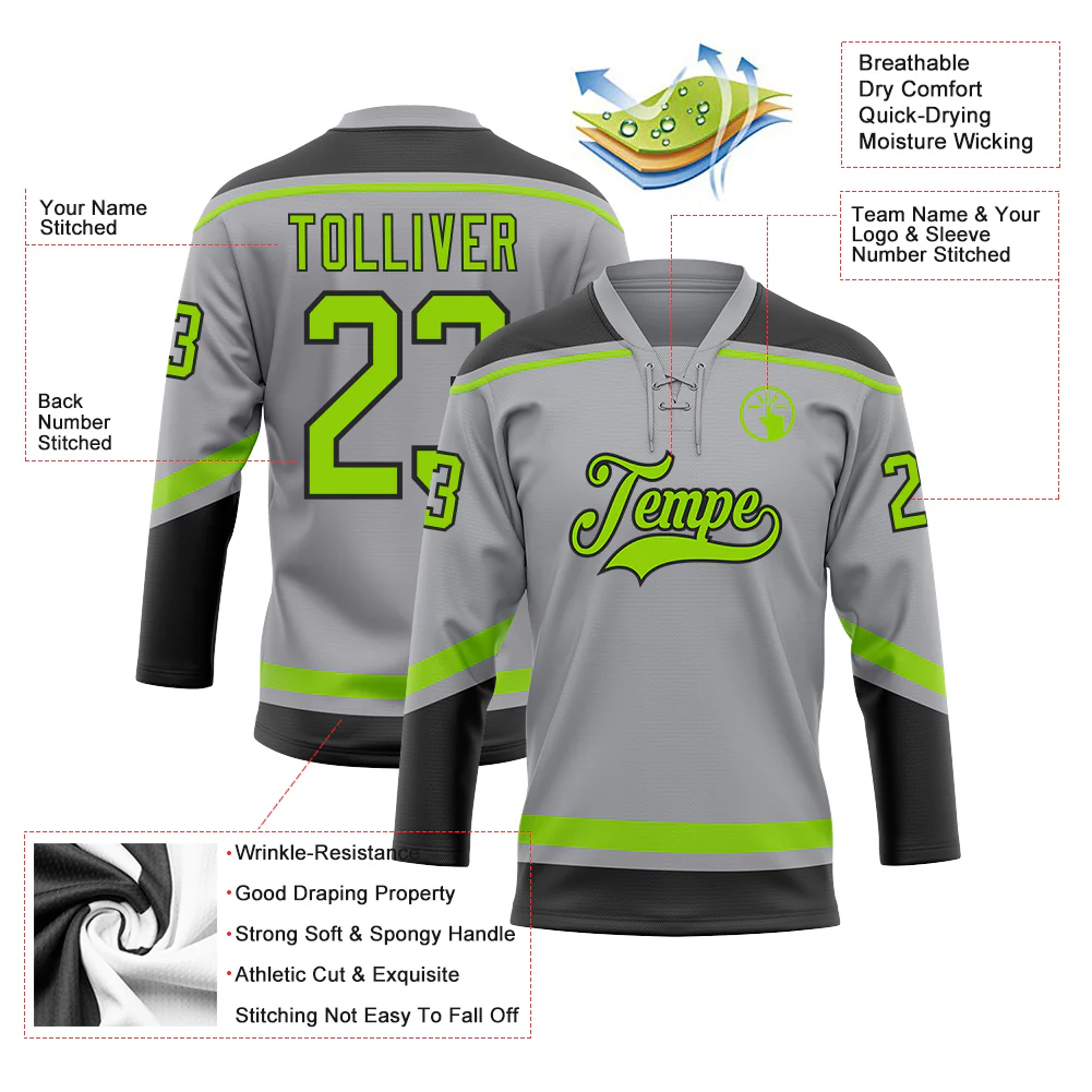 Custom Gray Neon Green-Black Hockey Lace Neck Jersey