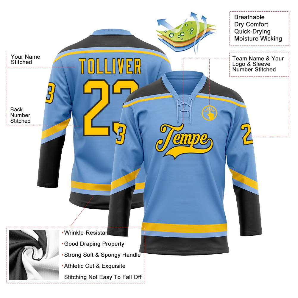Custom Light Blue Yellow-Black Hockey Lace Neck Jersey