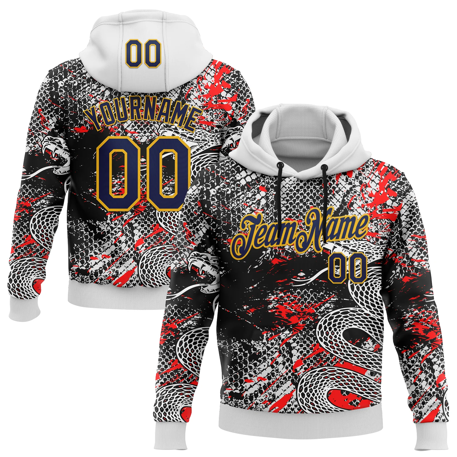 Custom Stitched White Navy Black Red-Gold 3D Pattern Design Snake Skin Print Sportswear Pullover Sweatshirt Hoodie