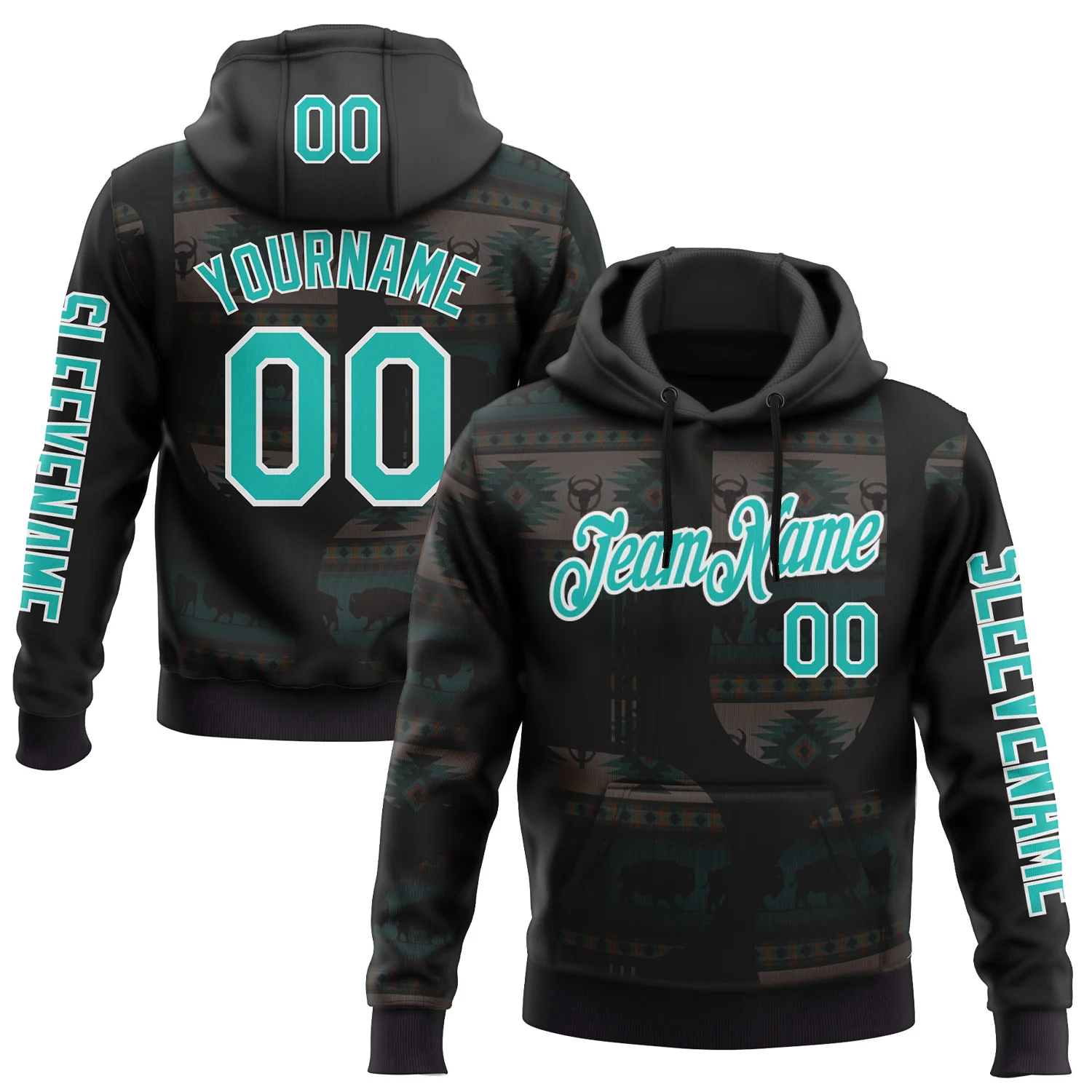 Custom Black Aqua-White 3D Pattern Design Ethnic Tribal Sportswear Pullover Sweatshirt Hoodie