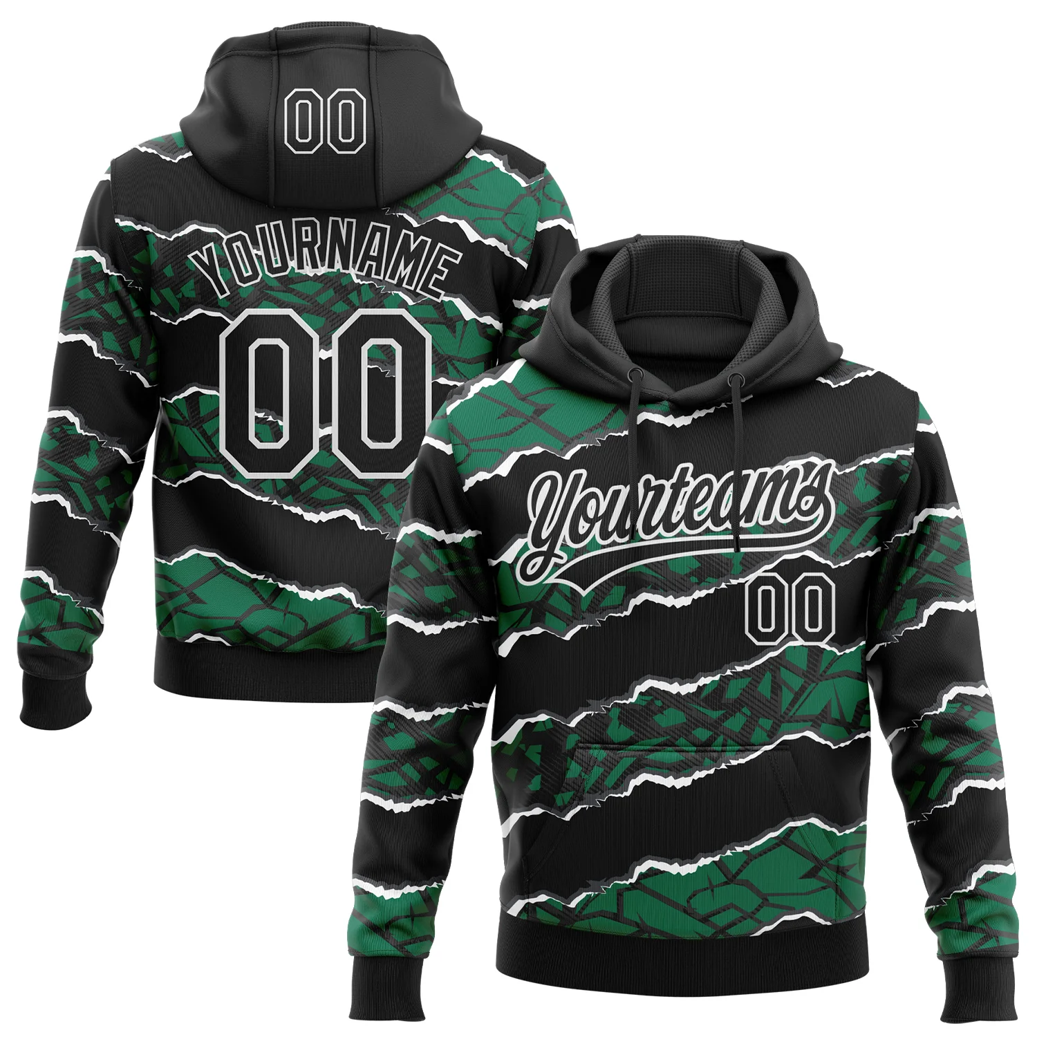 Custom Stitched Black Kelly Green-White 3D Pattern Design Torn Paper Style Sports Pullover Sweatshirt Hoodie