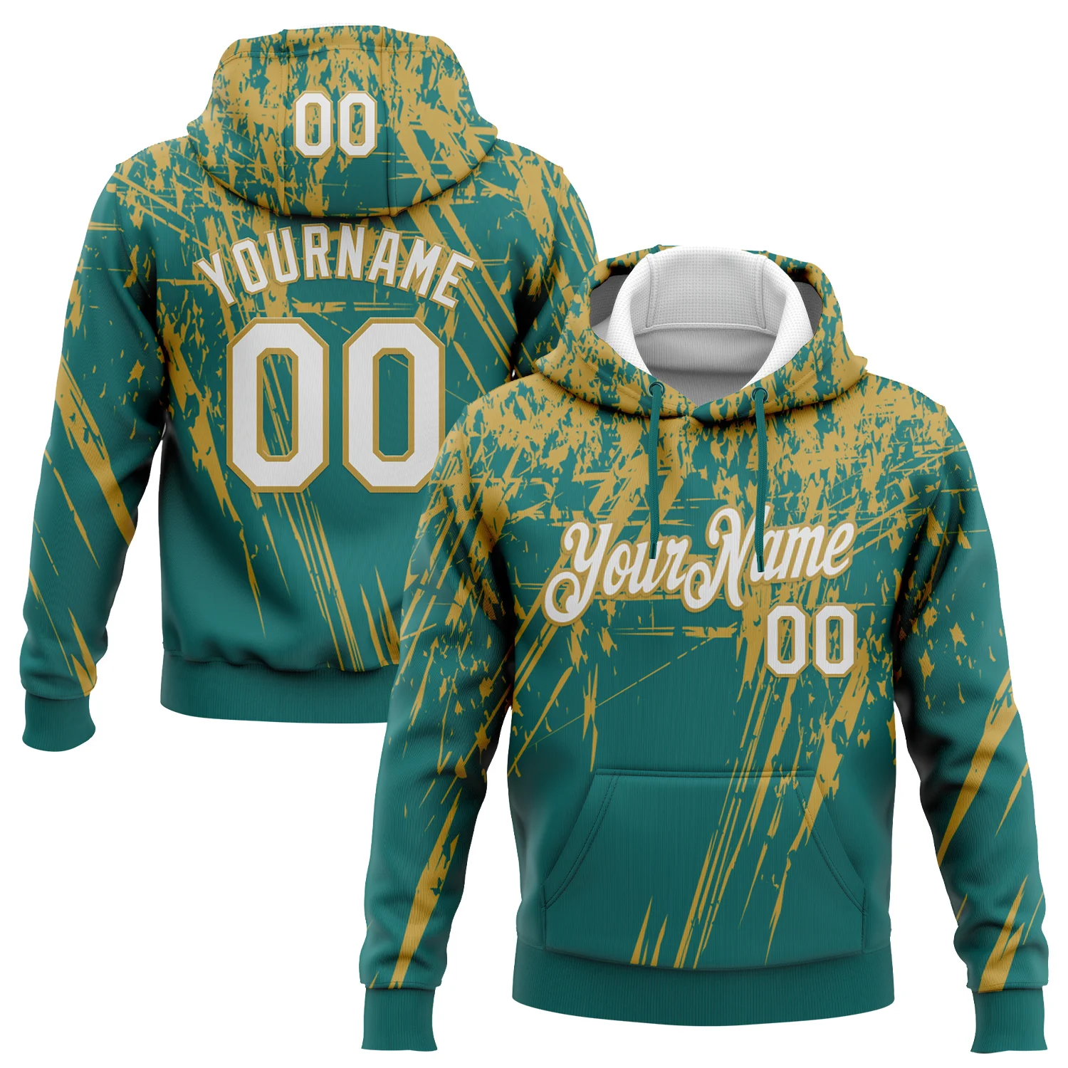 Custom Stitched Teal White-Old Gold 3D Pattern Design Splash Grunge Art Sports Pullover Sweatshirt Hoodie