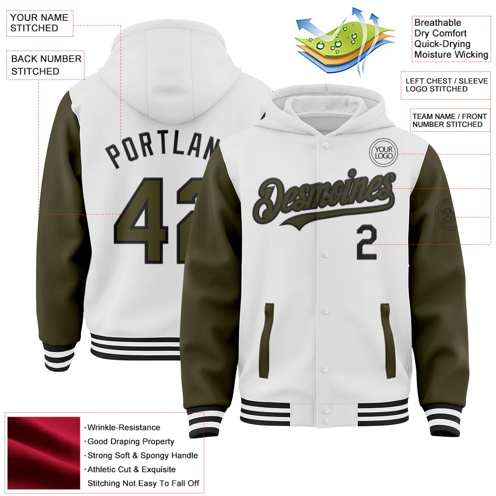 Custom White Olive-Black Bomber Full-Snap Varsity Letterman Two Tone Hoodie Jacket