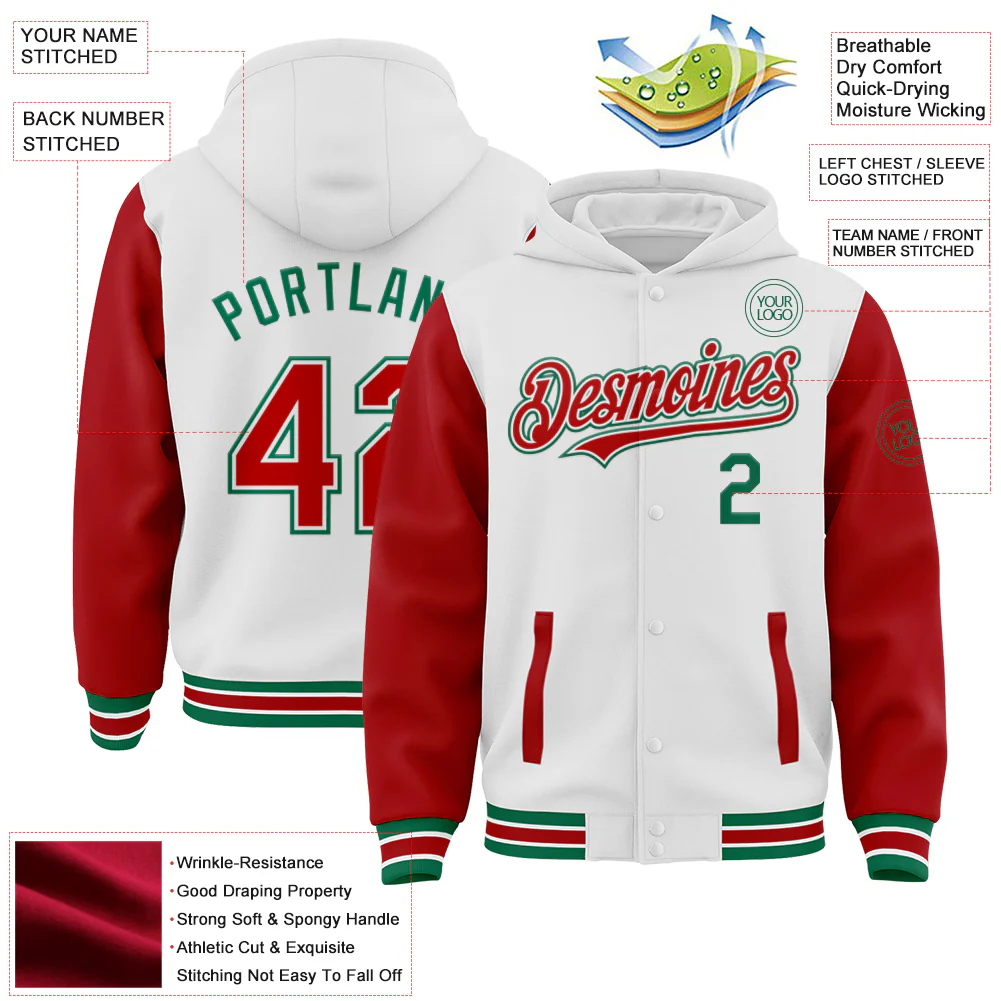 Custom White Red-Kelly Green Bomber Full-Snap Varsity Letterman Two Tone Hoodie Jacket