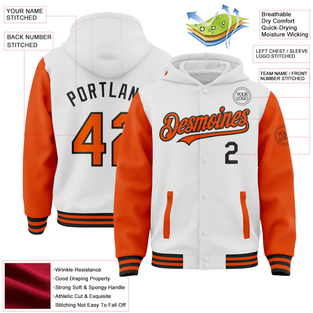 Custom White Orange-Black Bomber Full-Snap Varsity Letterman Two Tone Hoodie Jacket