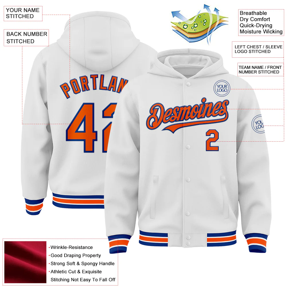 Custom White Royal-Orange Bomber Full-Snap Varsity Letterman Hoodie Jacket