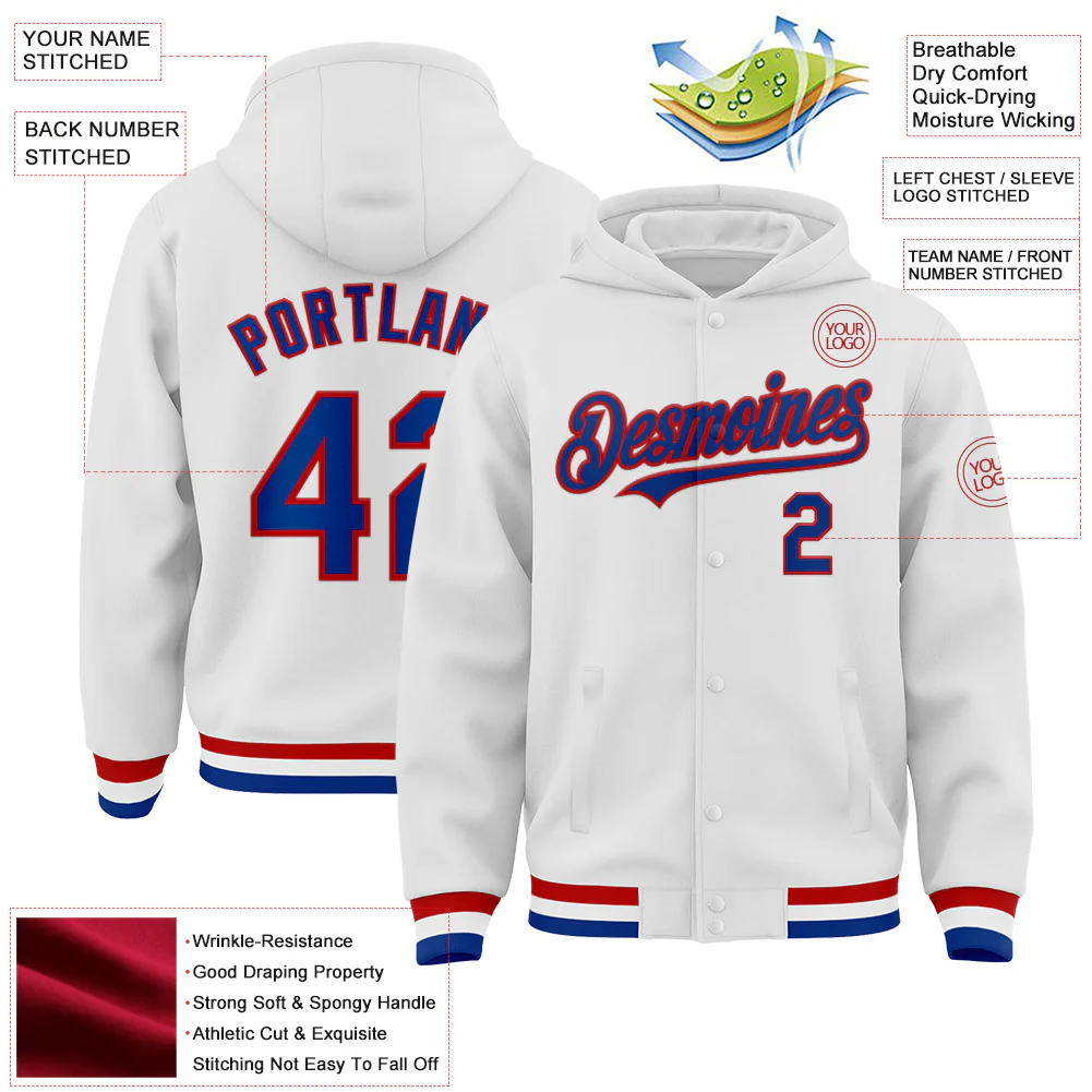 Custom White Red-Royal Bomber Full-Snap Varsity Letterman Hoodie Jacket