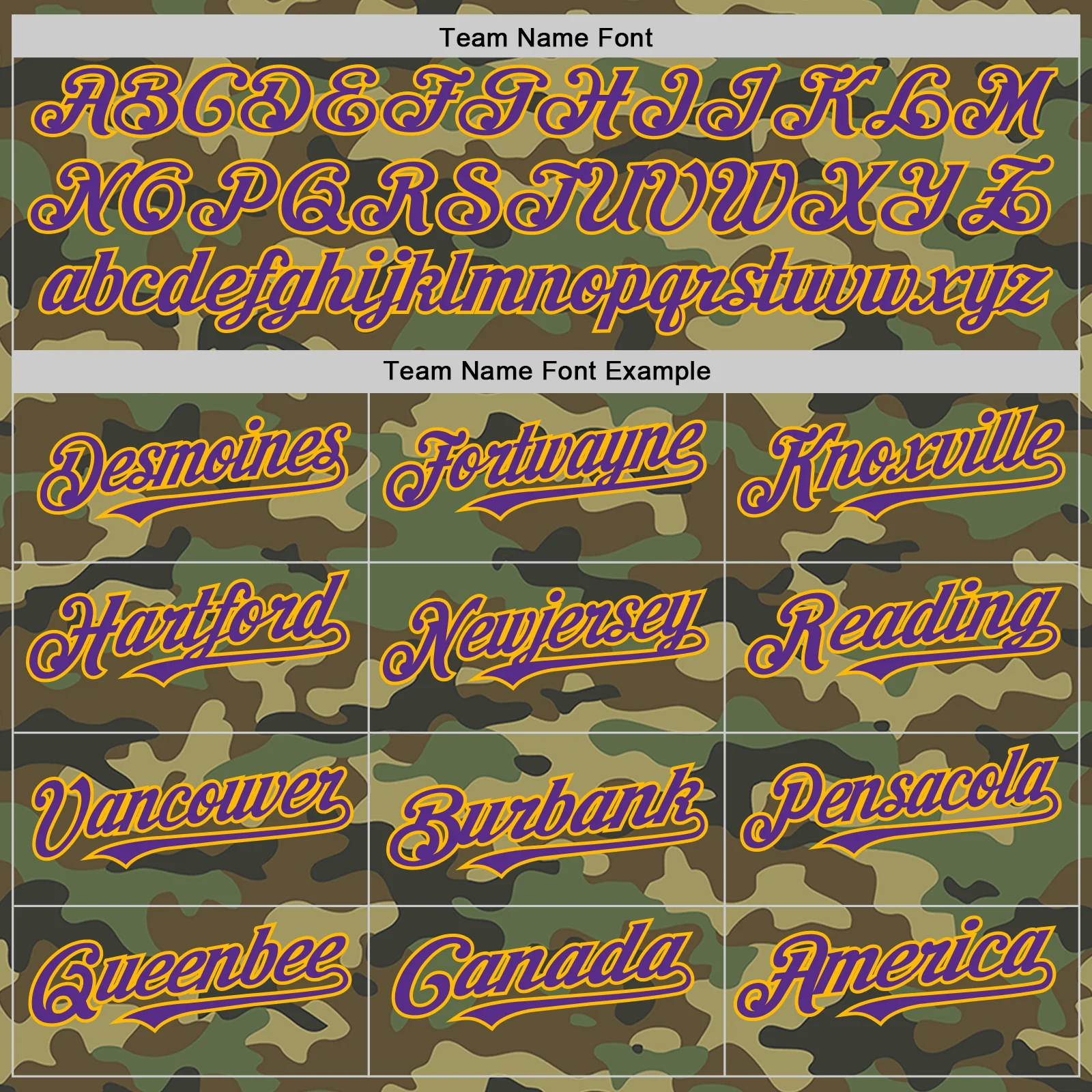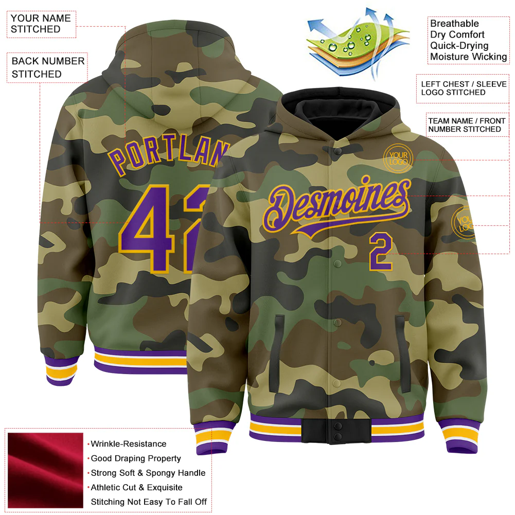 Custom Camo Purple-Gold Bomber Full-Snap Varsity Letterman Salute To Service Hoodie Jacket