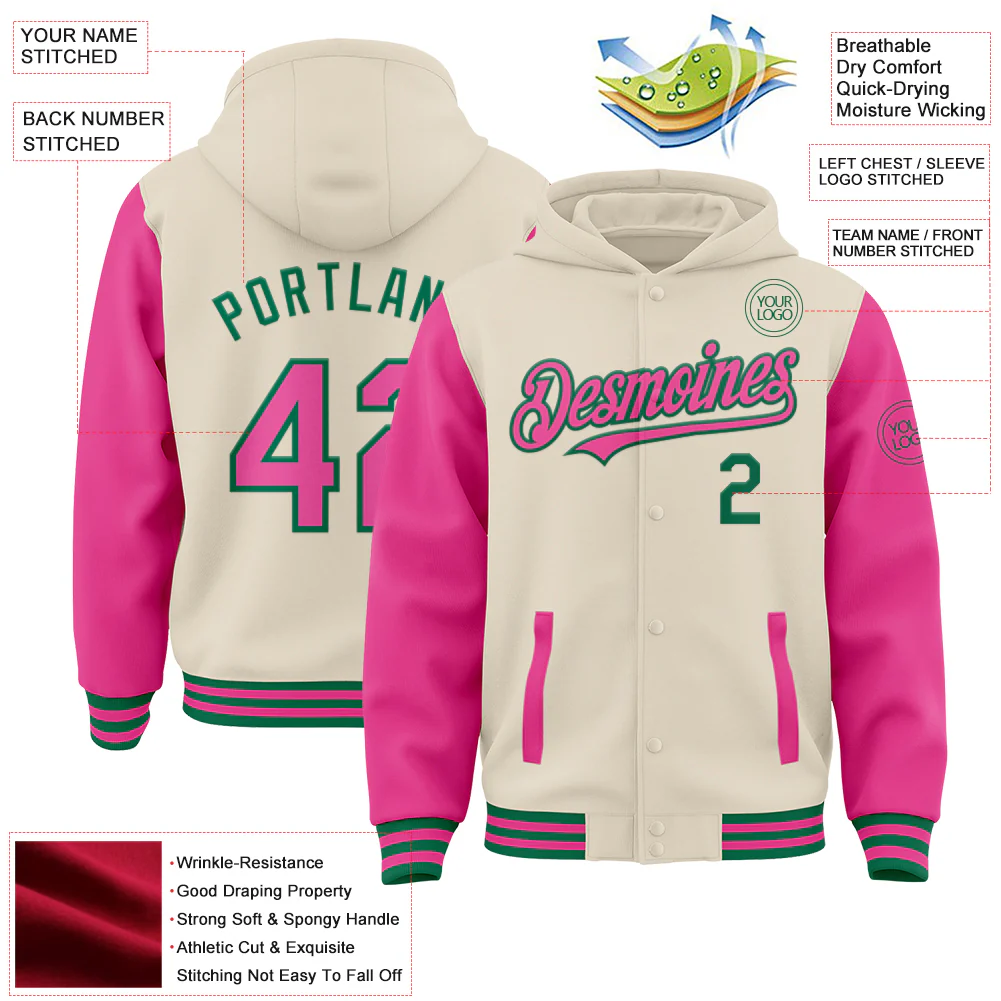 Custom Cream Pink-Kelly Green Bomber Full-Snap Varsity Letterman Two Tone Hoodie Jacket