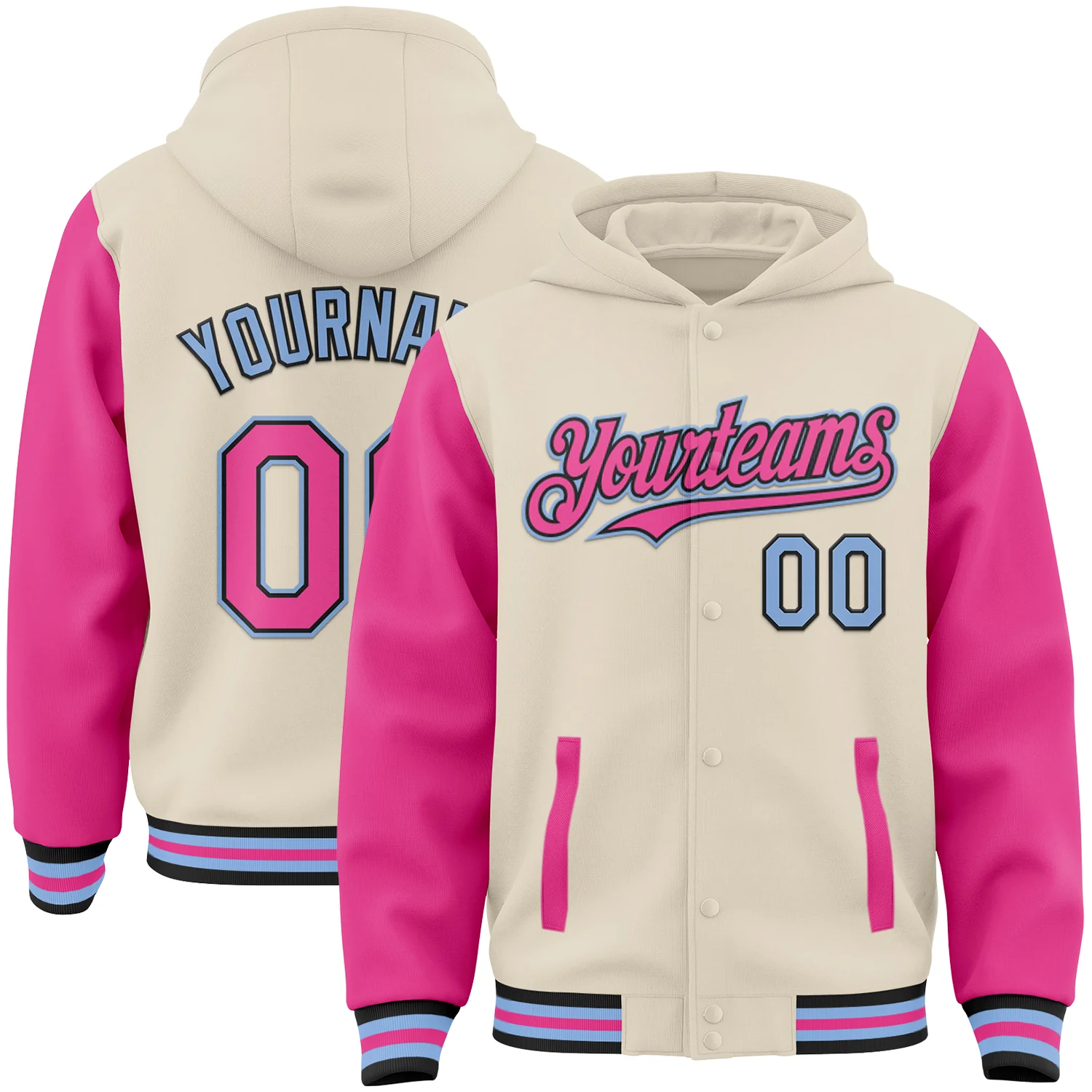 Custom Cream Pink Black-Light Blue Bomber Full-Snap Varsity Letterman Two Tone Hoodie Jacket