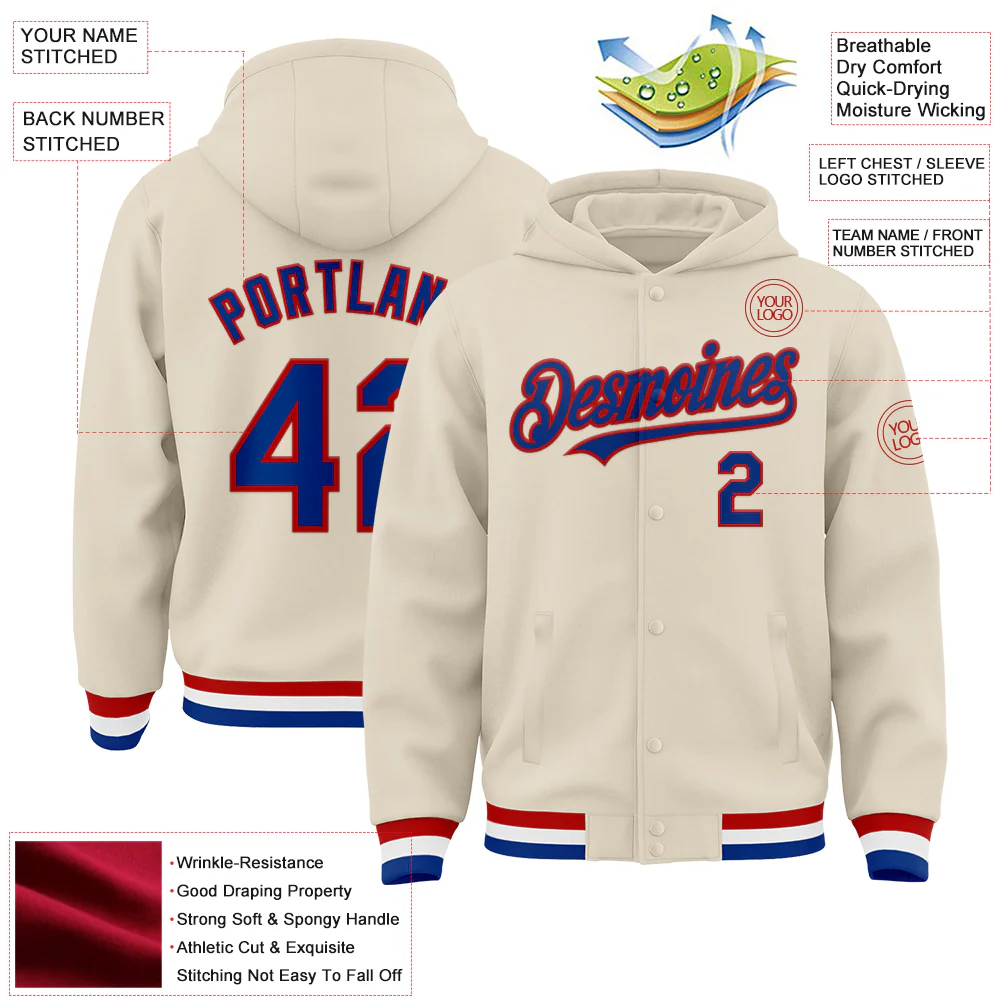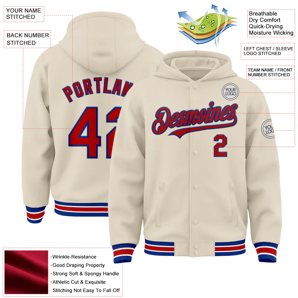 Custom Cream Red Royal-White Bomber Full-Snap Varsity Letterman Hoodie Jacket